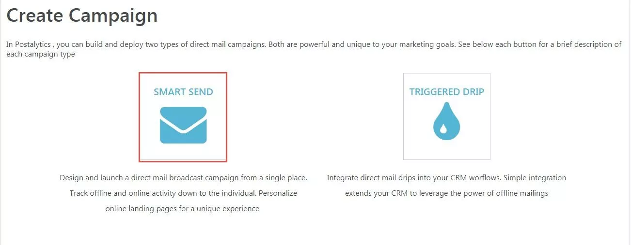 Postalytics Smart Send Direct Mail Campaigns are the most modern, integrated and powerful way to send list based, traditional direct mail. To learn more about trigger based, CRM driven direct mail, check out our Triggered Drip Campaign Help Doc.