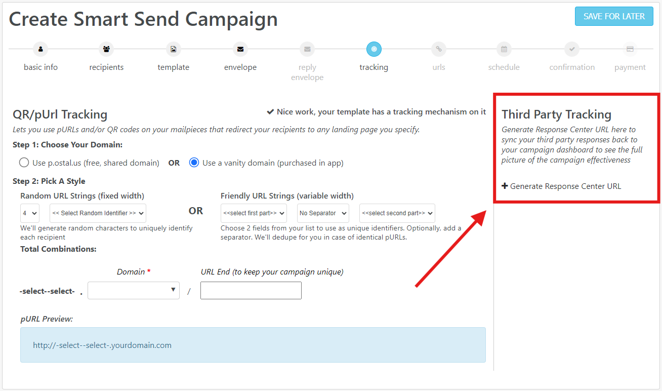Postalytics tracking lets you optionally use pURLS and/or QR codes on your mailpieces that redirect your recipients to any landing page you specify. If the template you chose has a pURL or QR code in it, you’ll be brought to this step. If your template does not include a pURL or QR, you’ll skip this step.