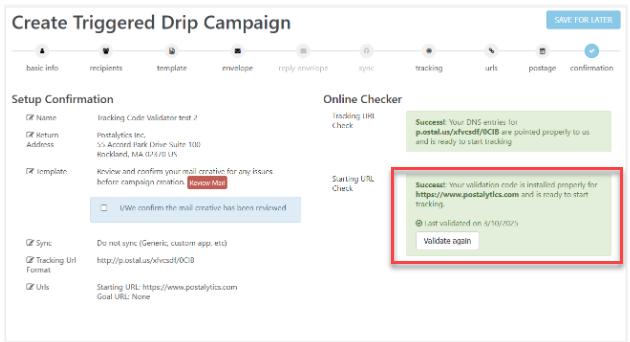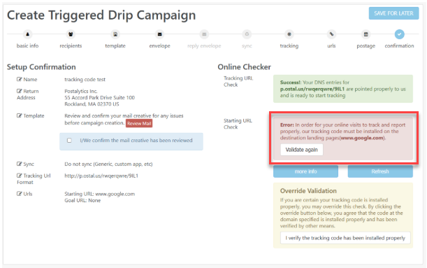If you’ve included a pURL in your campaign, we’ll perform checks to determine if your domain is properly set up and if the Postalytics Tracking Code is properly installed on your Starting URL landing page.