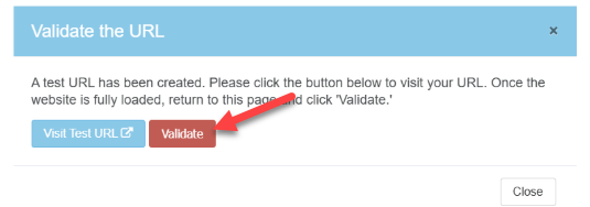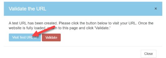 Next, in the popup, click on "Visit Test URL" and wait for the website to fully load. The system is checking for the Postalytics tracking code, so it is important to wait for the page to load completely.