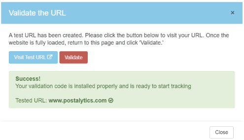 If the tracking code validation is successful, you will see a green "Success!" message. Click "Close" and continue on with the campaign creation.