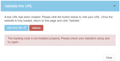 If you've recently validated the tracking code on your Starting URL page, the validation code area will be green with a “Success!” message, however, it can be validated again, if you choose too.