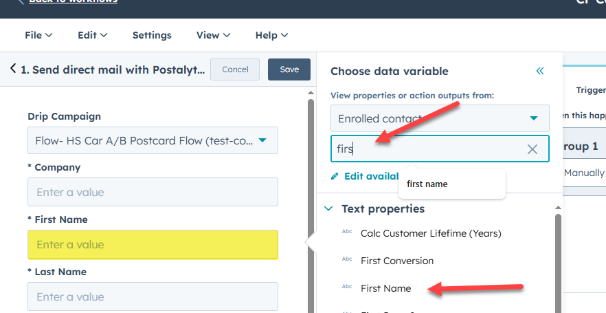 Enrollment and Data Mapping: The workflow enrolls the associated "Contact" record (the potential buyer list) into the flow and the relevant data from the "Property" object (address, new price, etc.) is mapped to a Postalytics-compatible field.
