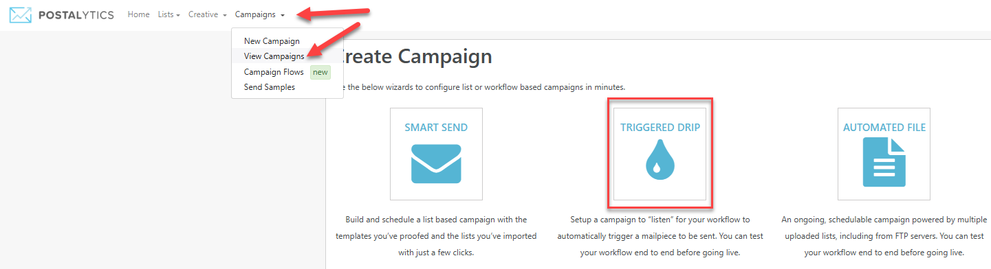 Begin by selecting: Campaigns in the top menu selection, then click “New Campaign” > “Triggered Drip”.
