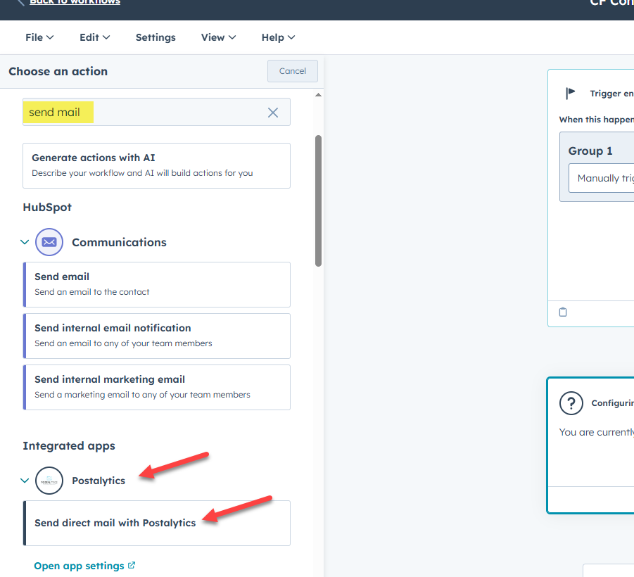 To the left of the workflow, use the search box to search for “send mail”, or scroll down the panel to the ‘Integrated apps’ section, and find Postalytics.