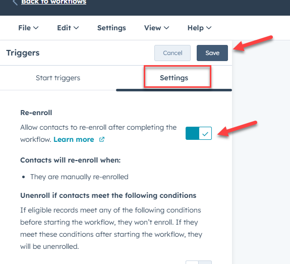 If the records chosen for the test will also be live records once testing is complete, be sure to adjust the settings for the trigger to allow contacts to re-enroll.