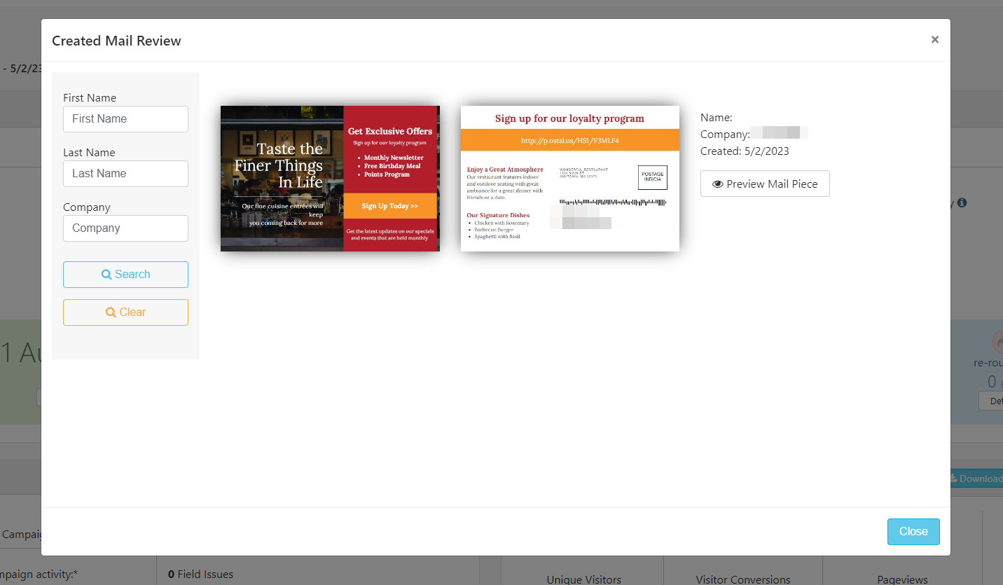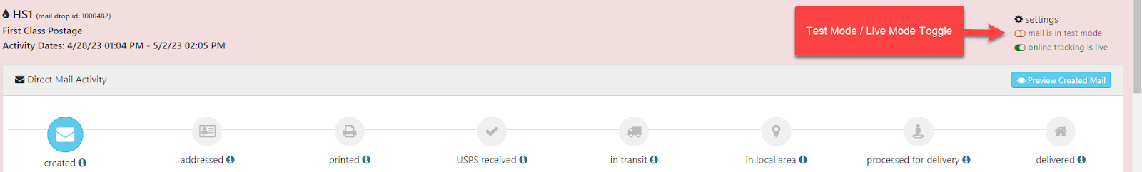Once your campaign has been toggled to “Live Mode” and your triggers are coming through, clicking “Preview Created Mail” will show live mail that has actually been sent to the printer.