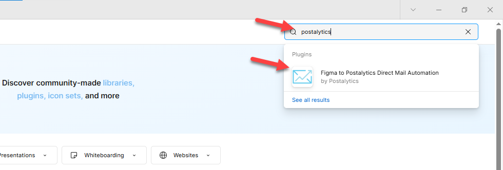 - From the Figma home page, go to the Community tab in the upper right and search for "Postalytics." Click the Postalytics Plugin.