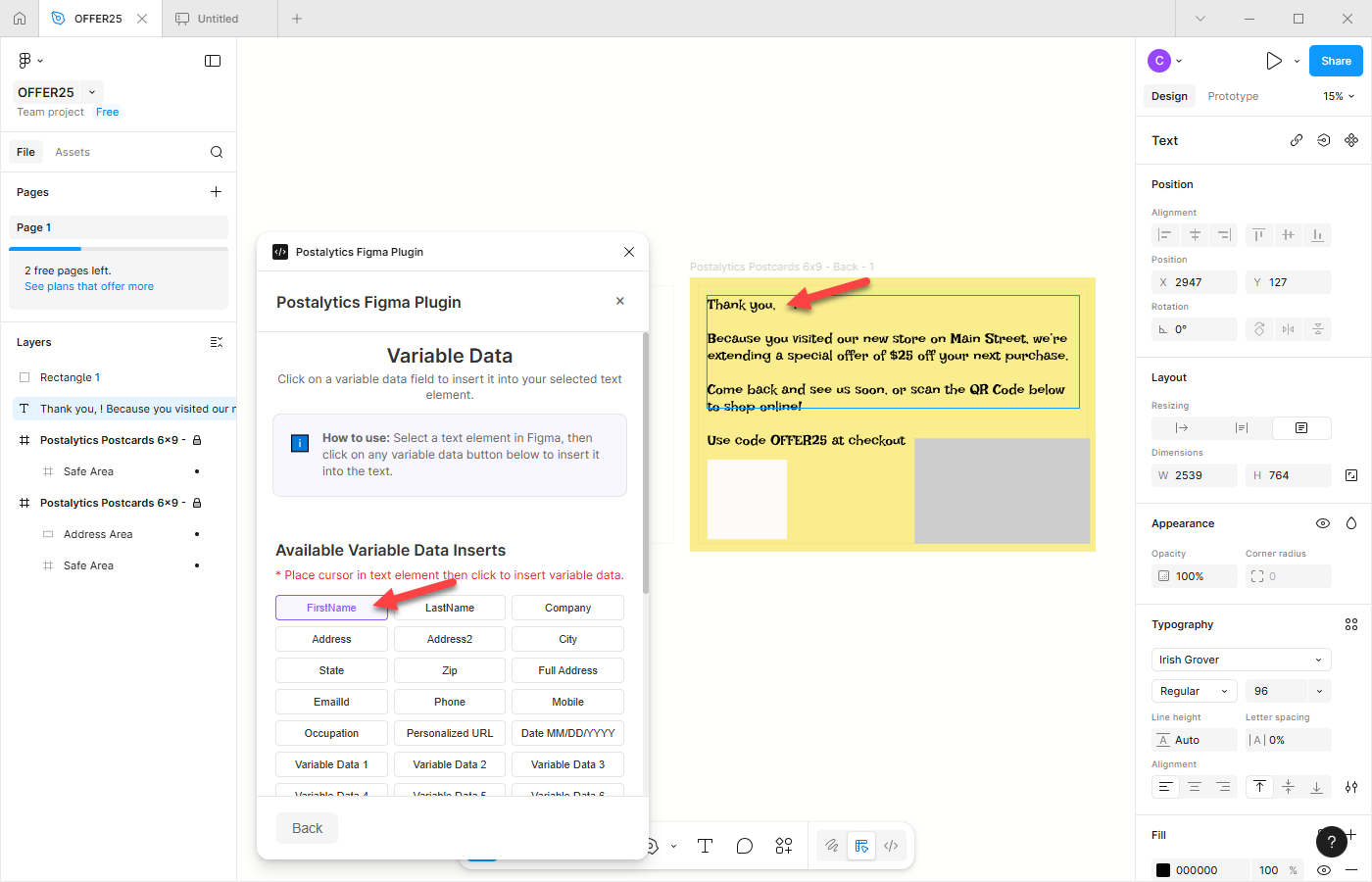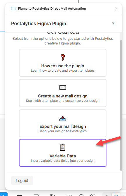 - Insert Variable Data fields from Postalytics while working in Figma. The Figma integration is a “plugin” for Figma that enables Postalytics to incorporate more features into the Figma design interface than other design tools allow. By incorporating Postalytics Variable Data elements directly in Figma, designers are able to greatly simplify the process of layering personalization into their direct mail templates.