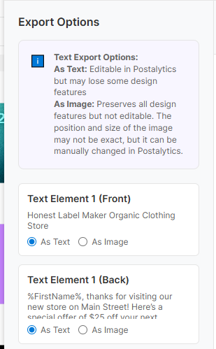 - Design elements and fonts not supported within the Postalytics application can be exported as images rather than text using the options to the left of the preview. It’s important to note that any text with a variable should not be exported as an image.