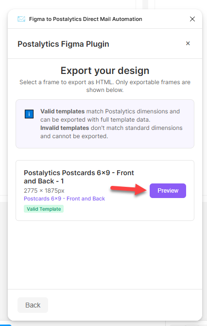 The Postalytics plugin features a direct integration that packages your Figma frames and pushes them directly into your Postalytics account.