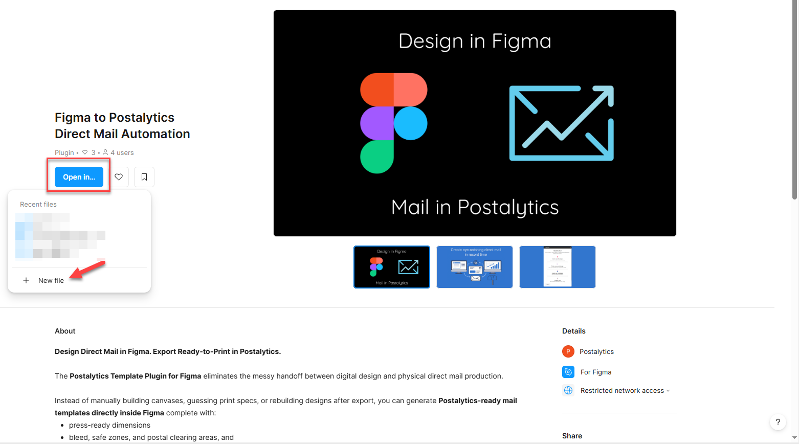 To start, find the Postalytics plugin within the Figma application. This links your workspace to our template library.